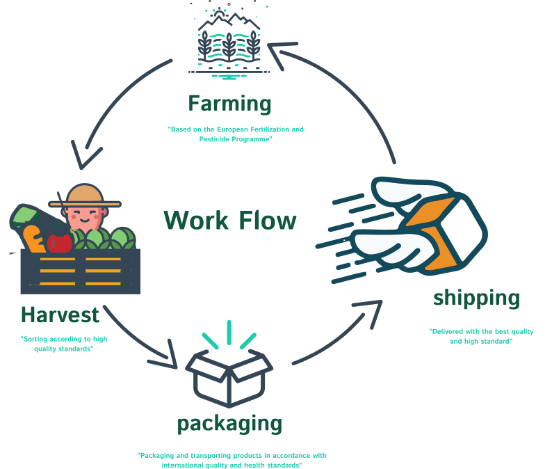 We care about our products, starting from cultivation. So, all fertilization, nutrition, and pest control processes are done under the full supervision of GrowthChem to ensure obtaining fruits completely free of any pesticide residues that may harm the environment or humans. Then we move forward to collecting the fruits using the right methods that preserve the shape and quality of the fruits by the hands of carefully trained farmers, Last but not least to the processes of washing, sorting, production, then packing according to needed specifications, followed by export using the fastest and safest shipping methods to ensure that the products arrive fresh in the quickest time and lowest cost.